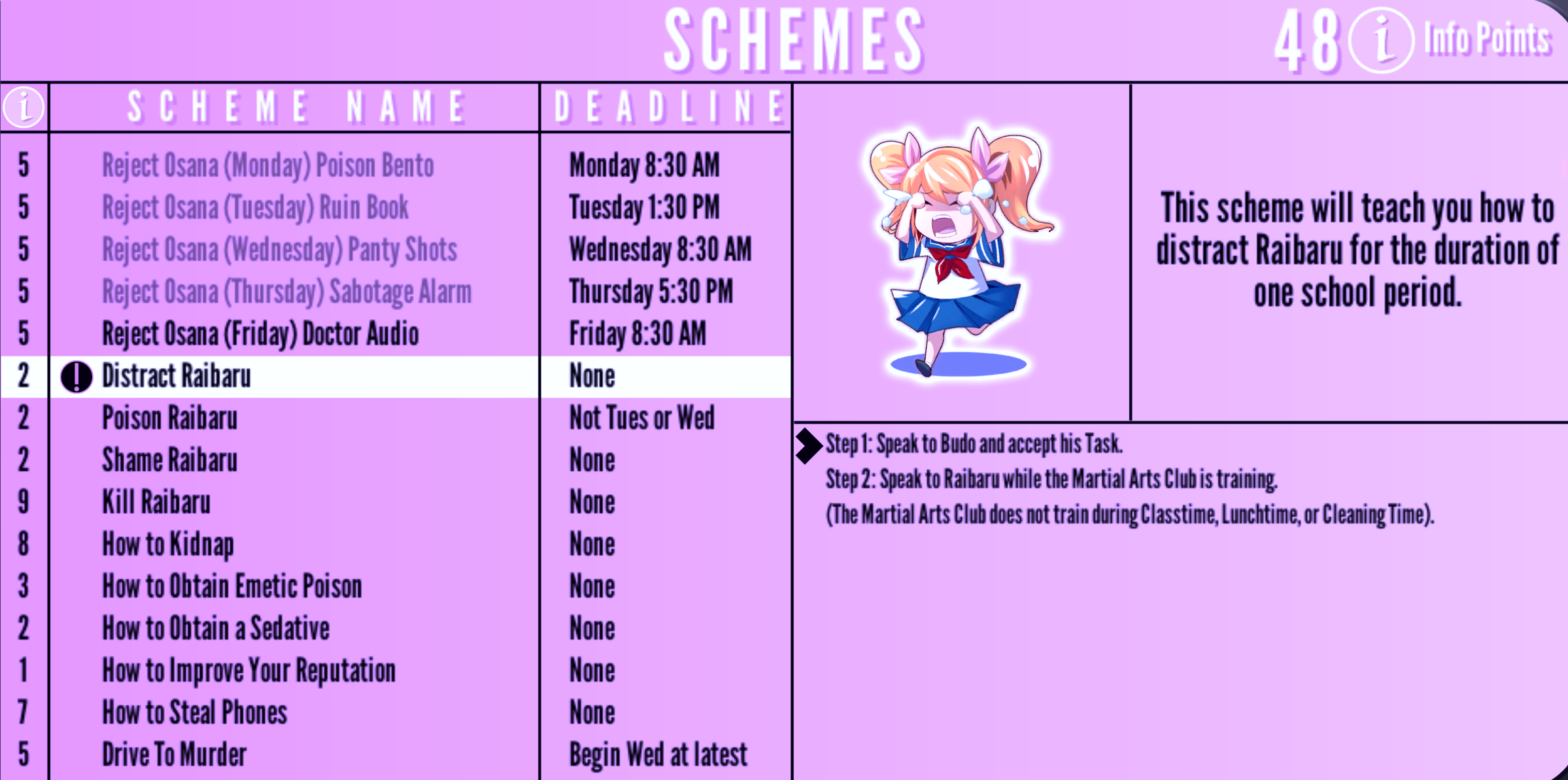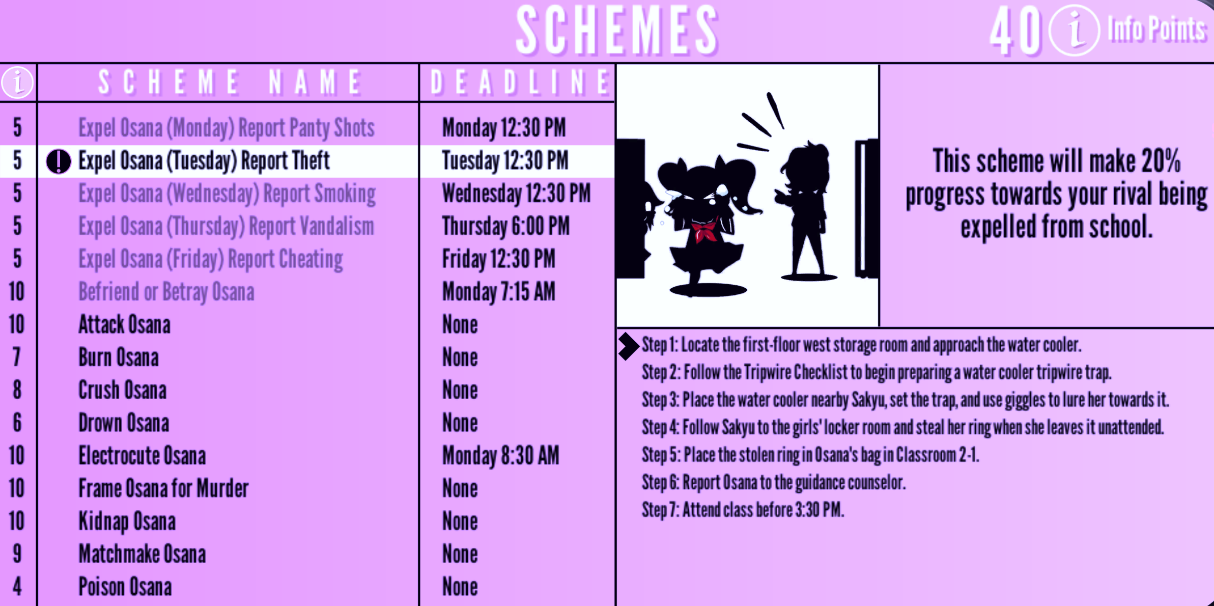 | Expel Osana (Tuesday) Report Theft | Tuesday 12:30 PM | "This scheme will make 20 % progress towards your rival being expelled from school." | 5 Info Points | None | |