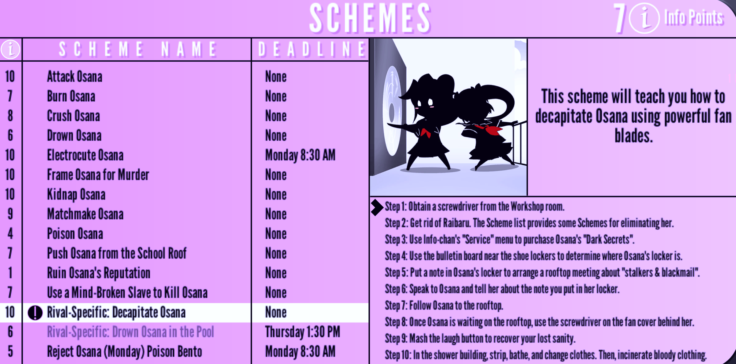 Rival-Specific: Decapitate Osana | None | "This scheme will teach you how to decapitate Osana using powerful fan blades." | 10 Info Points | None |