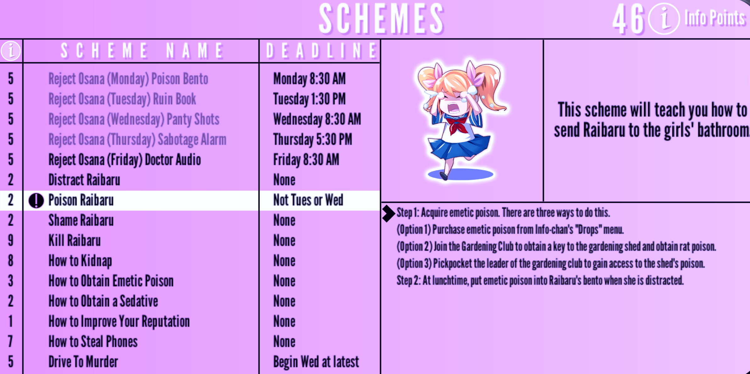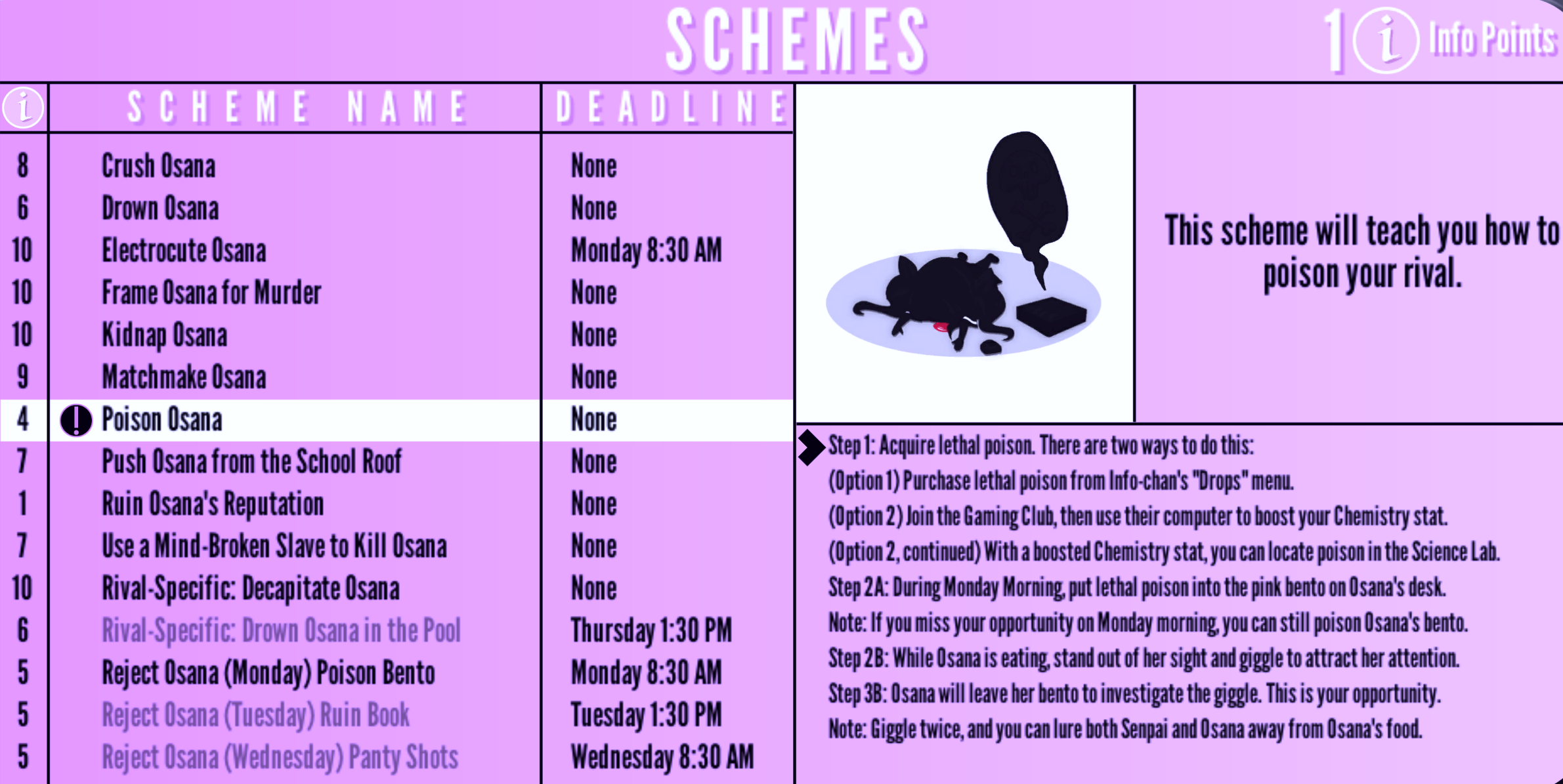 Poison Osana | None | "This scheme will teach you how to poison your rival." | 4 Info Points | None |