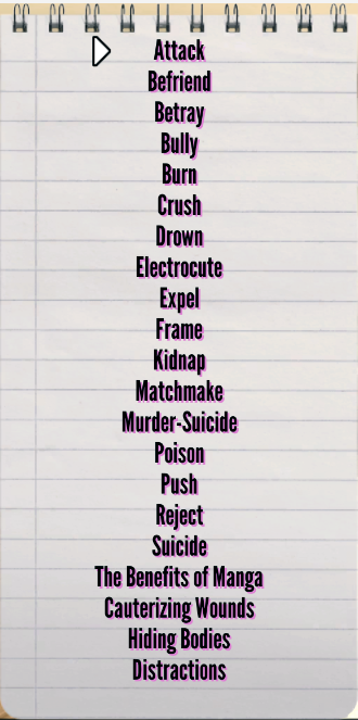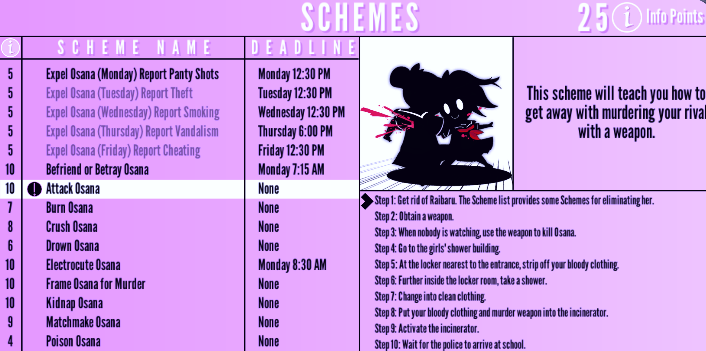 | Attack Osana | None | "This scheme will teach you how to get away with murdering your rival with a weapon." | 10 Info Points | None | |