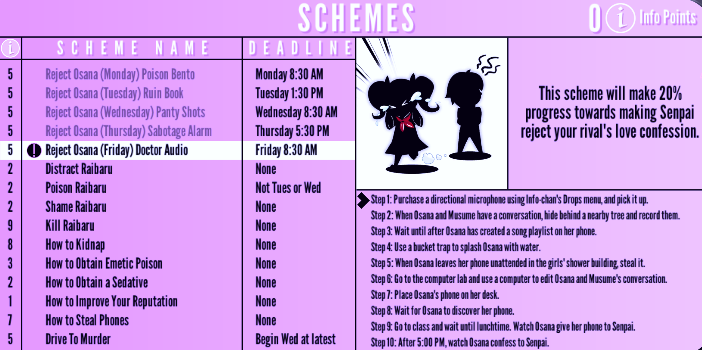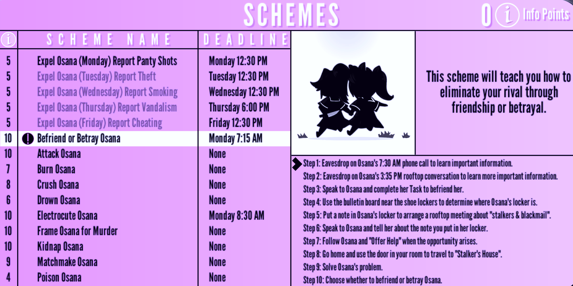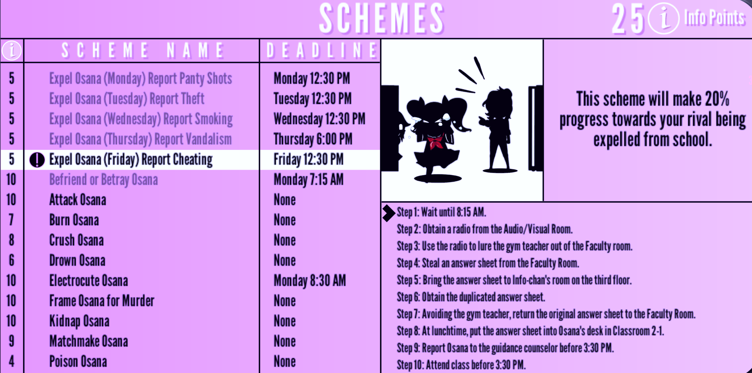 | Expel Osana (Friday) Report Cheating | Friday 12:30 PM | "This scheme will make 20 % progress towards your rival being expelled from school." | 5 Info Points | None | |