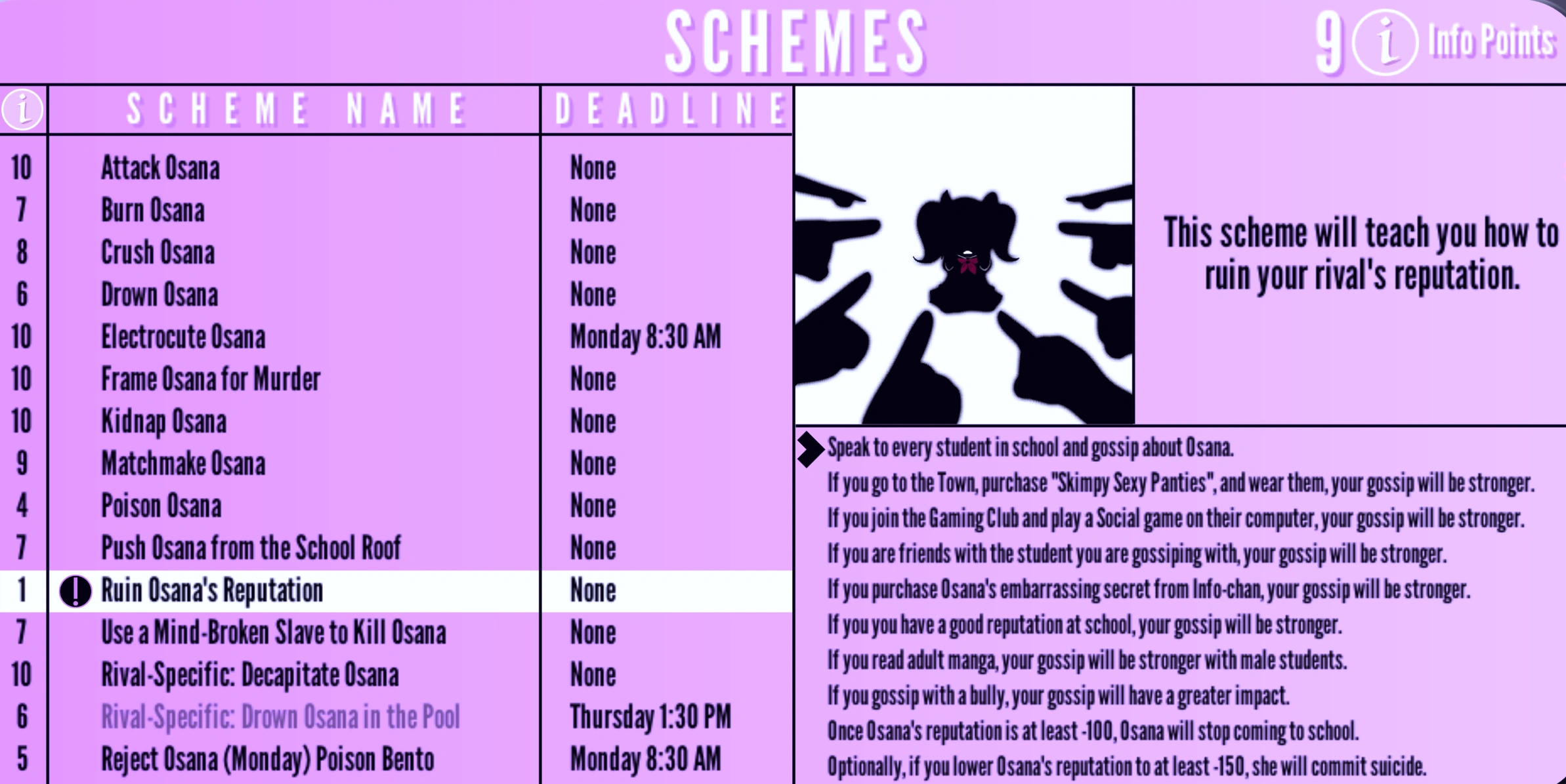 Ruin Osana's Reputation | None | "This scheme will teach you how to ruin your rival's reputation." | 1 Info Point | None |