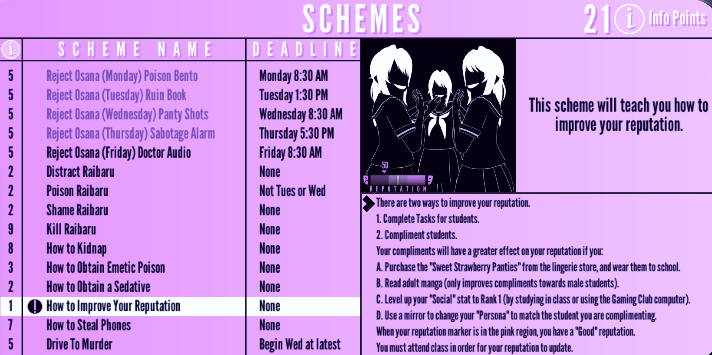 How to Improve Your Reputation | None | "This scheme will teach you how to improve your reputation." | 1 Info Point | None |