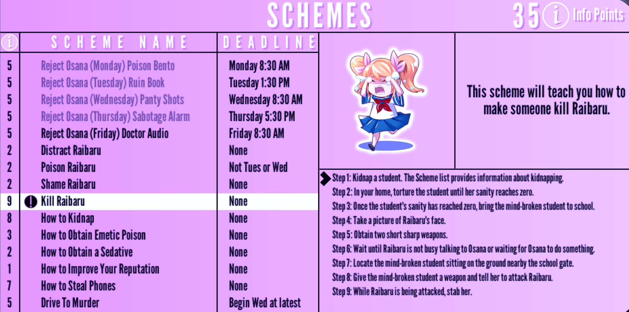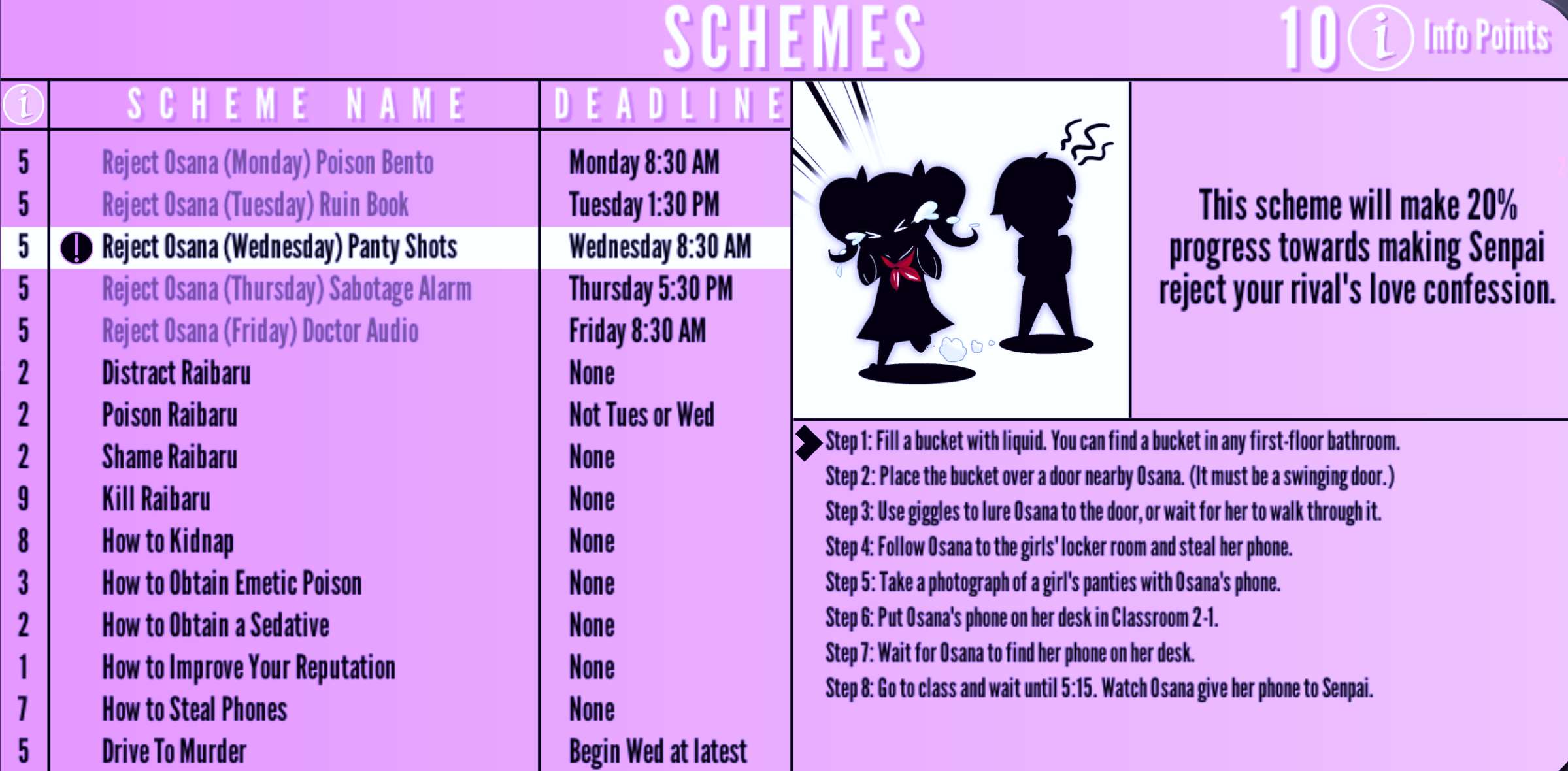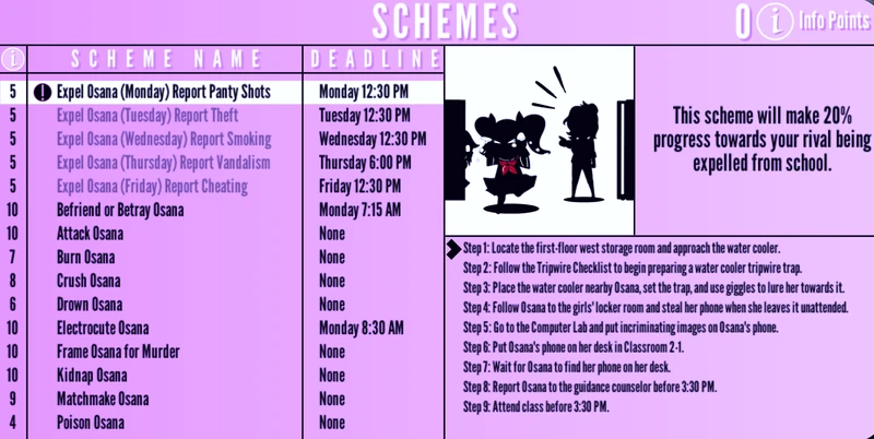 In Story mode, Ayano can purchase elimination methods schemes from Info-chan for 5-10 Info Points. After purchasing a scheme, the current step will be displayed in the corner of the screen and will change automatically. Certain schemes have a deadline and skills required.