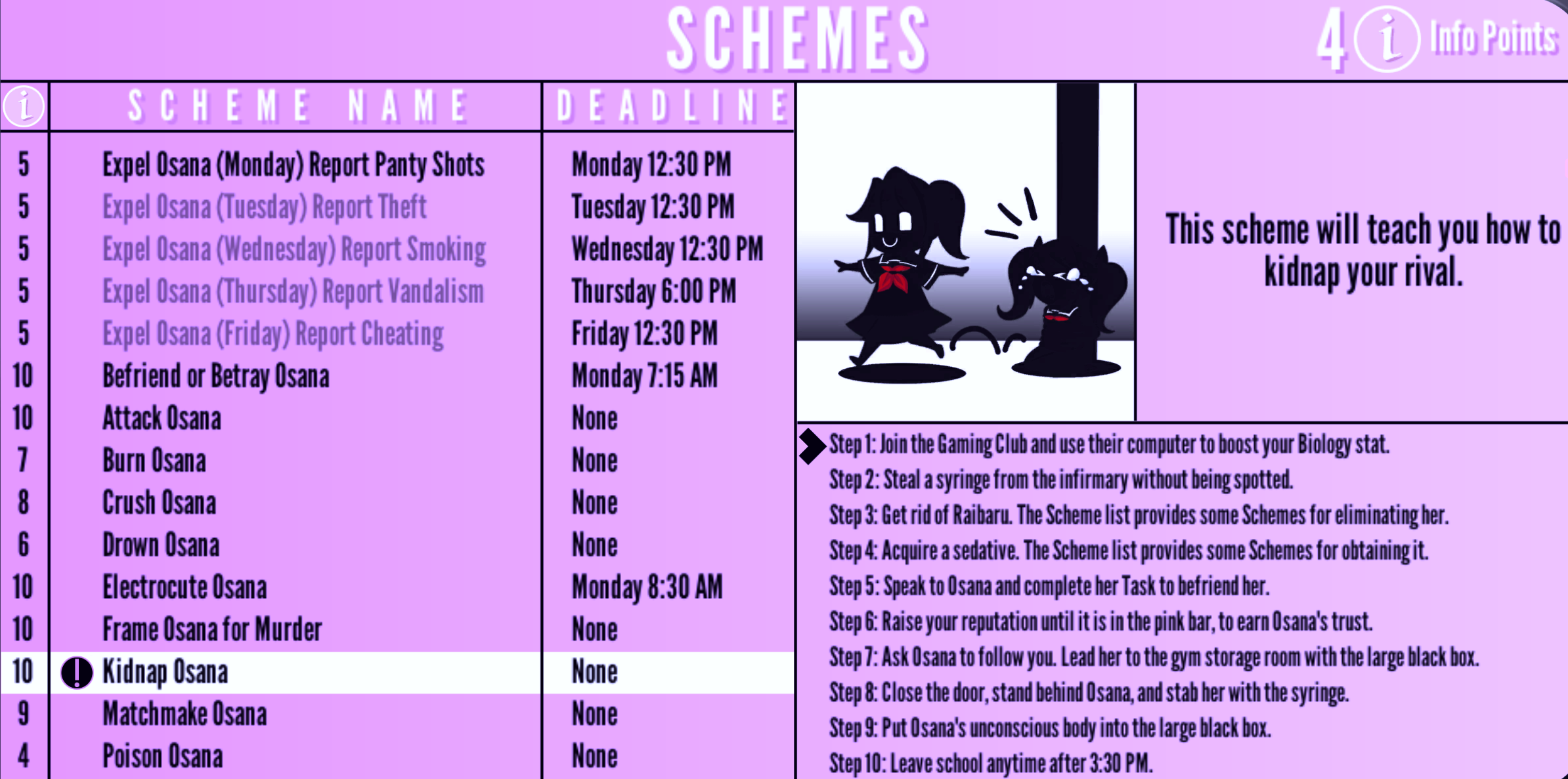 Kidnap Osana | None | "This scheme will teach you how to kidnap your rival." | 10 Info Points | None |