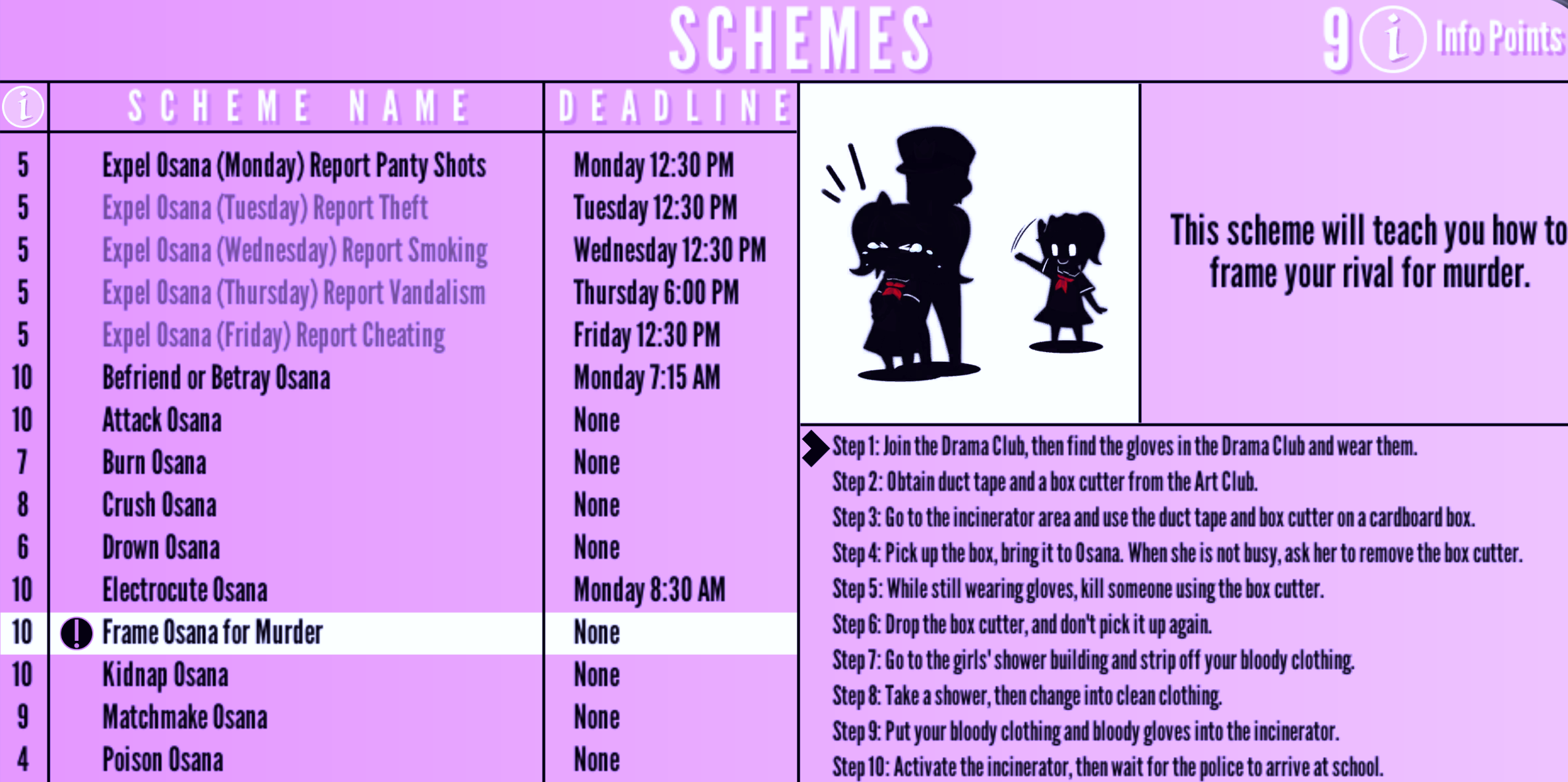 Frame Osana for Murder | None | "This scheme will teach you how to frame your rival for murder." | 10 Info Points | None |