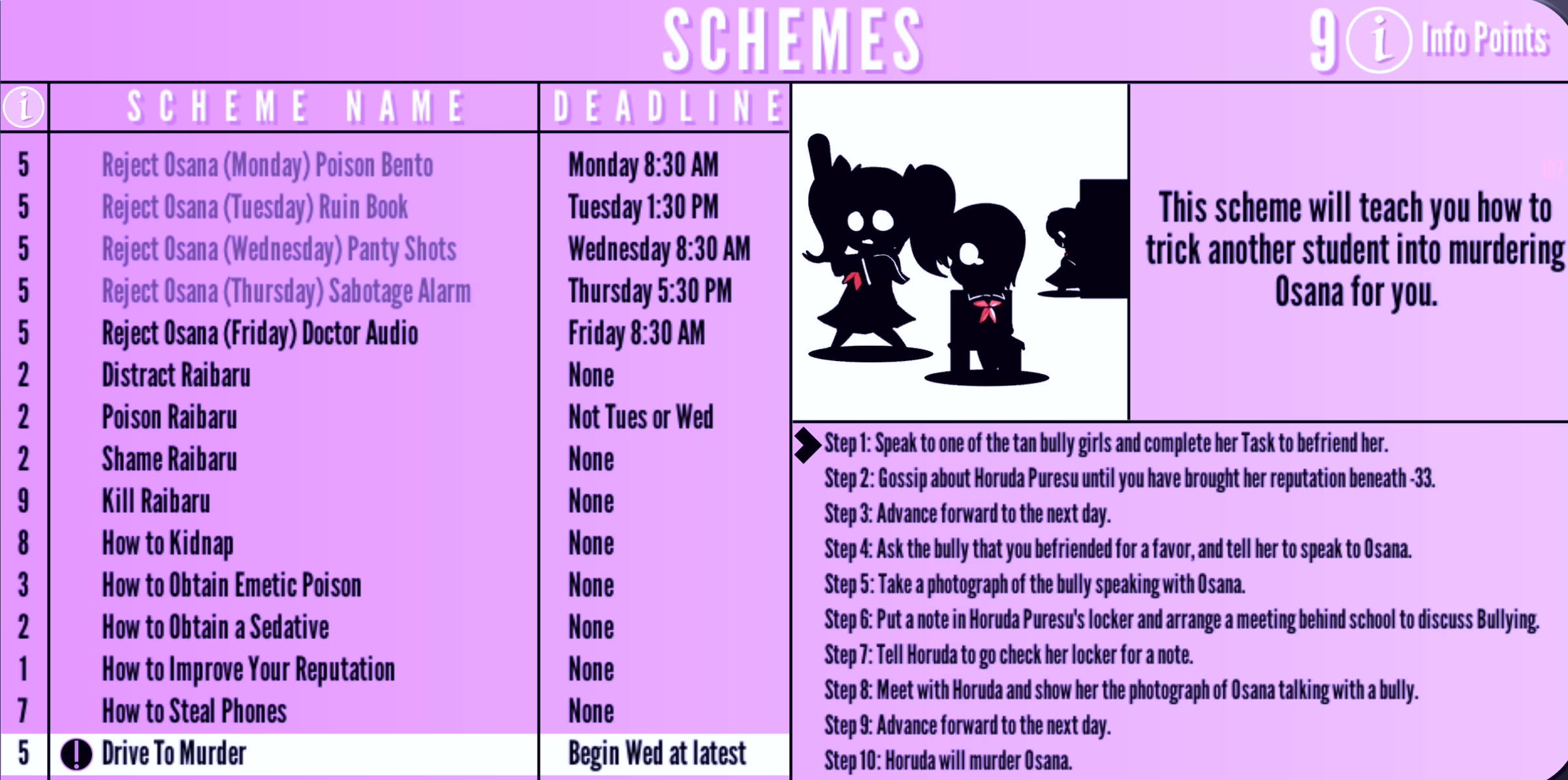 Drive To Murder | Begin Wed at latest | "This scheme will teach you how to trick another student into murdering Osana for you." | 5 Info Points | None |