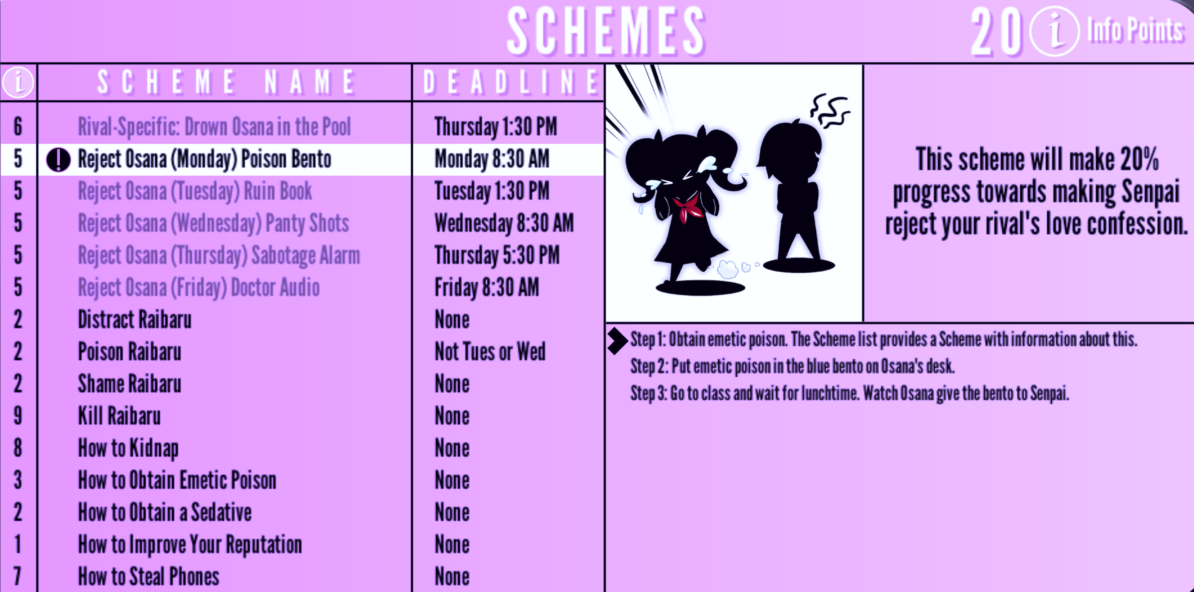 Reject Osana (Monday) Poison Bento | Monday 8:30 AM | "This scheme will make 20 % progress towards making Senpai reject your rival's love confession." | 5 Info Points | None |