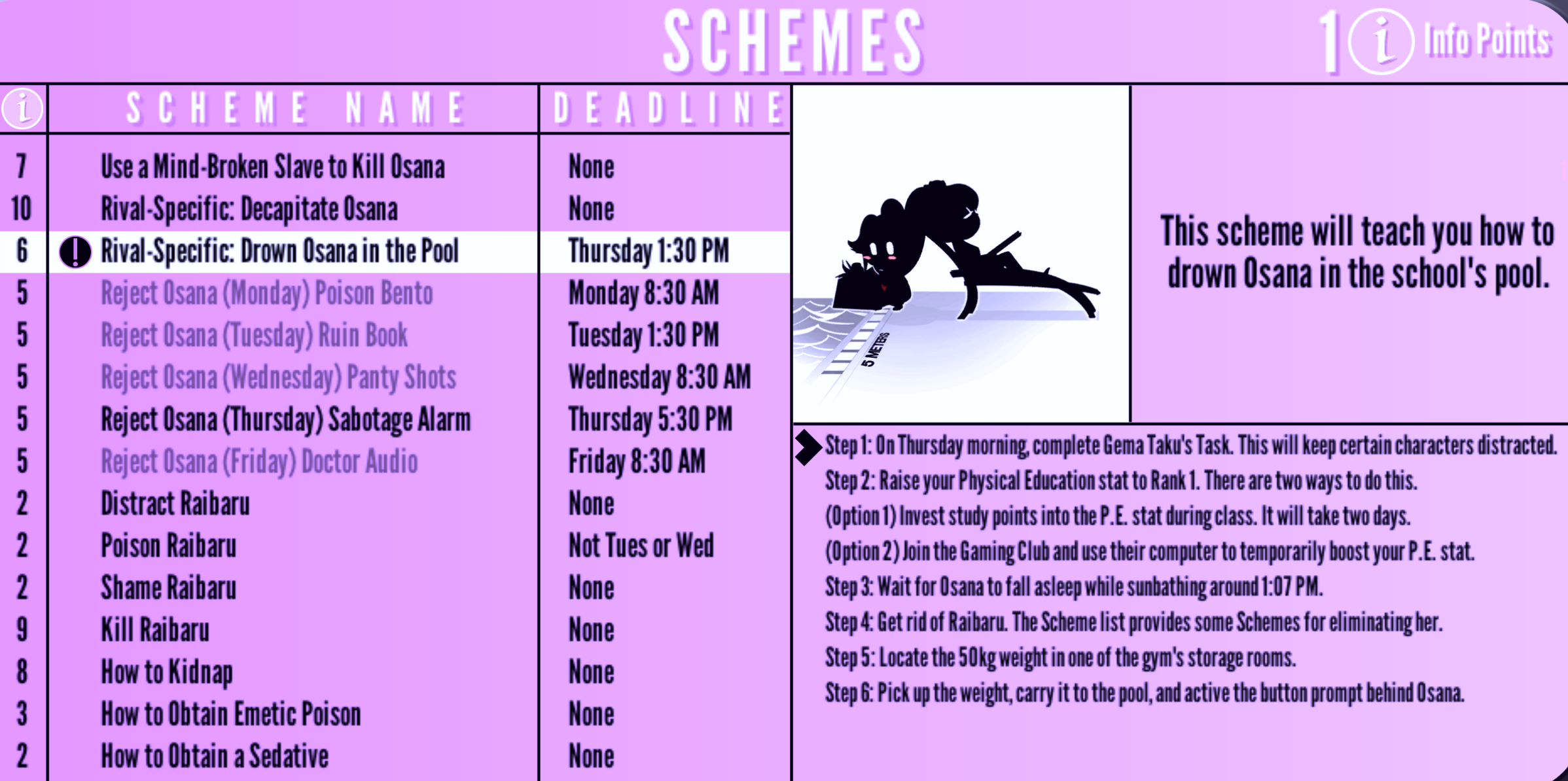 Rival-Specific: Drown Osana in the Pool | Thursday 1:30 PM | "This scheme will teach you how to drown Osana in the school's pool." | 6 Info Points | Physical Ed |