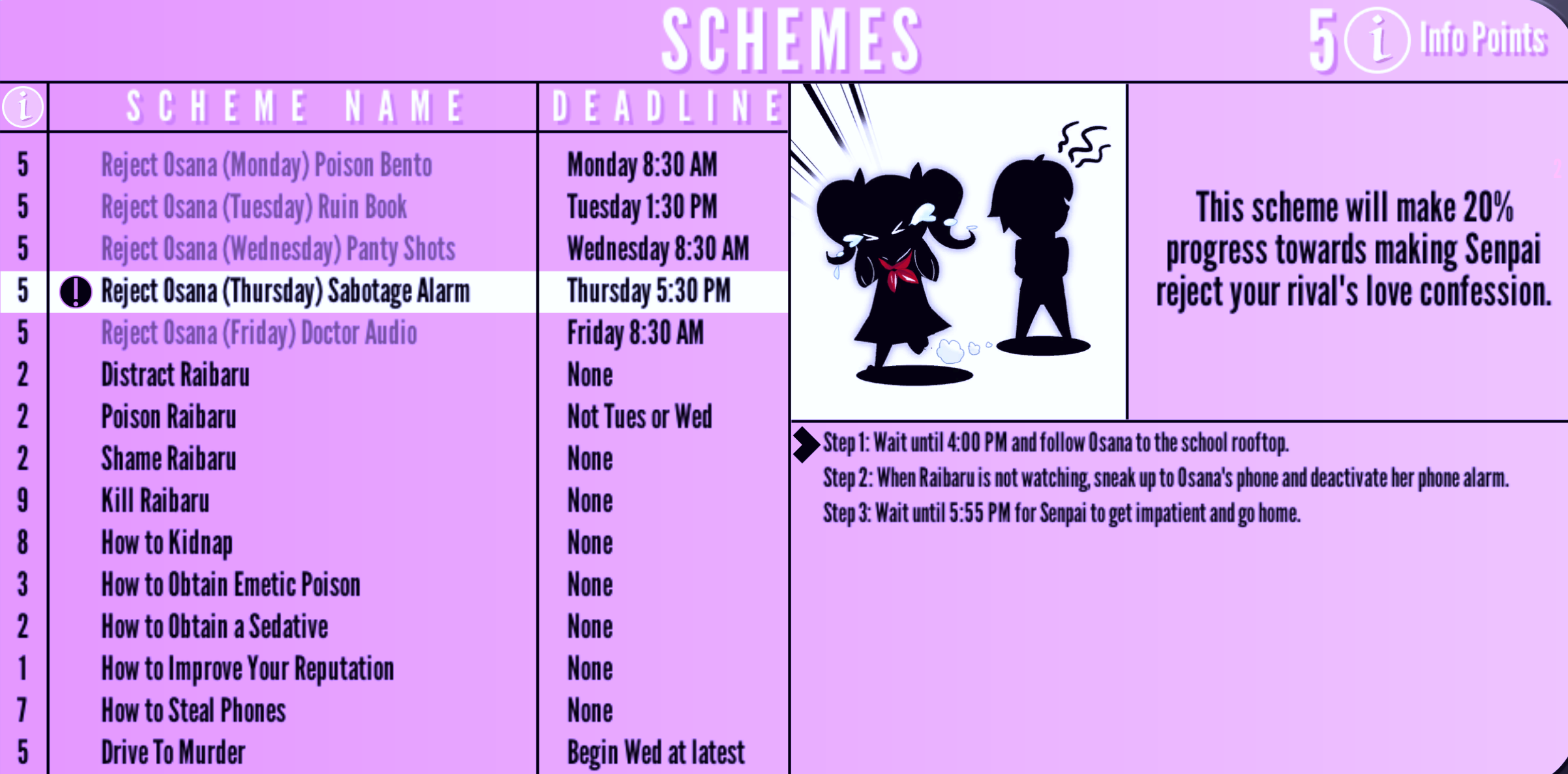 | Reject Osana (Thursday) Sabotage Alarm | Thursday 5:30 PM | "This scheme will make 20 % progress towards making Senpai reject your rival's love confession." | 5 Info Points | None | |