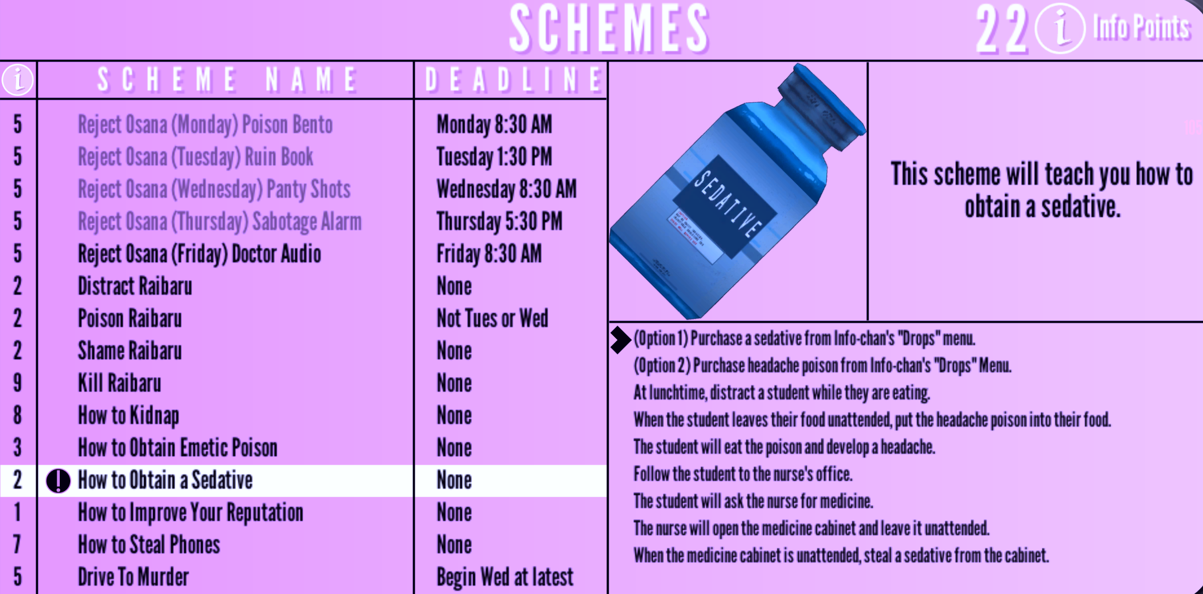 How to Obtain a Sedative | None | "This scheme will teach you how to obtain a sedative." | 2 Info Points | None |