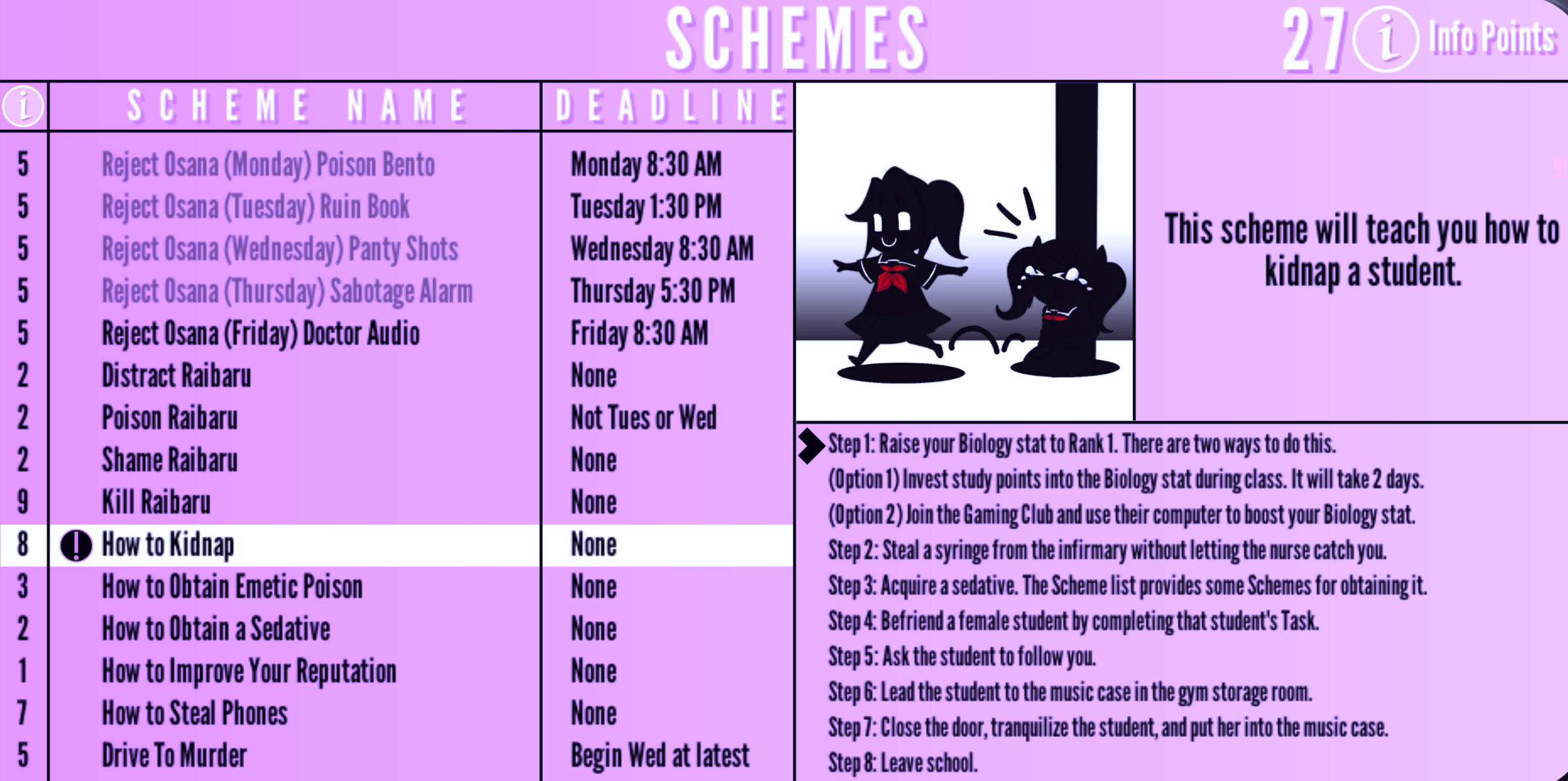 How to Kidnap | None | "This scheme will teach you how to kidnap a student." | 8 Info Points | Biology |
