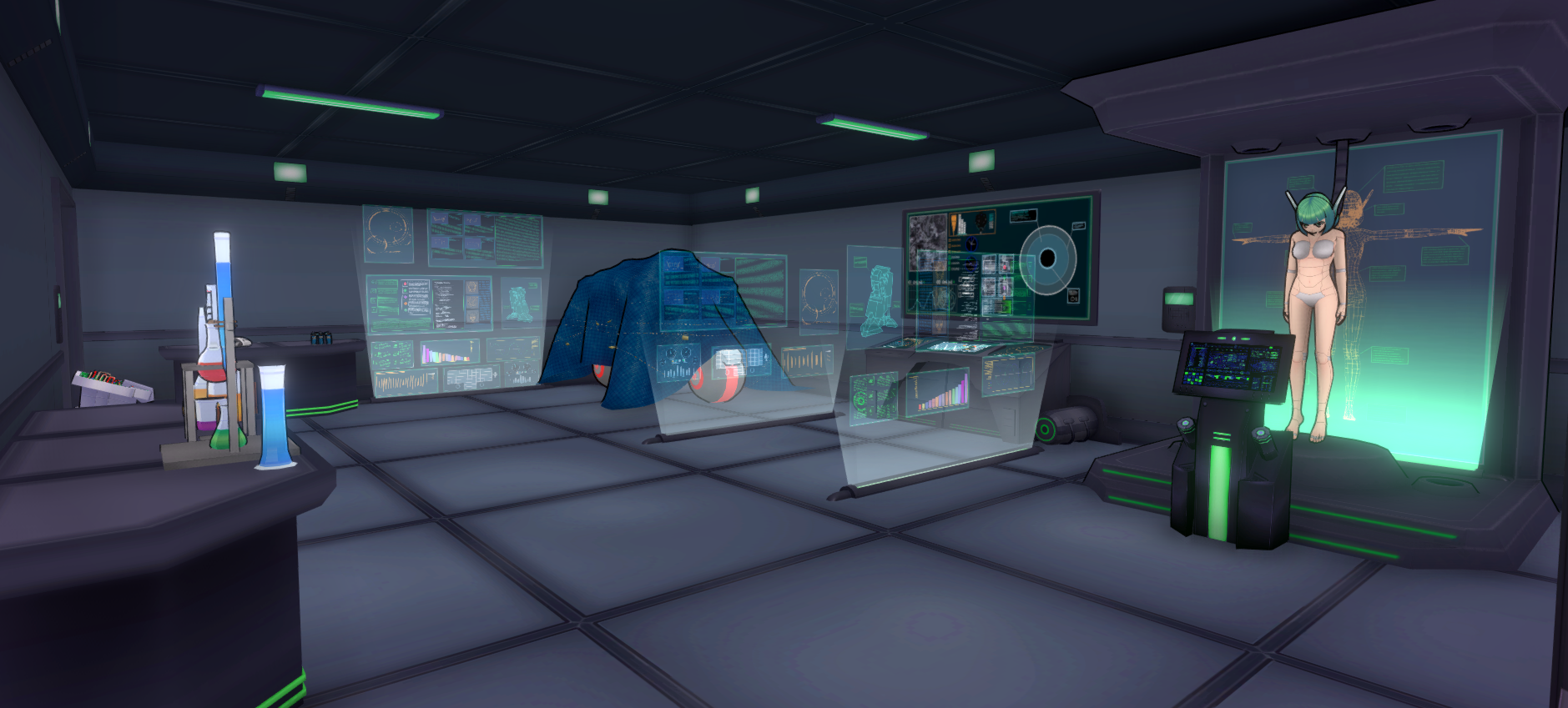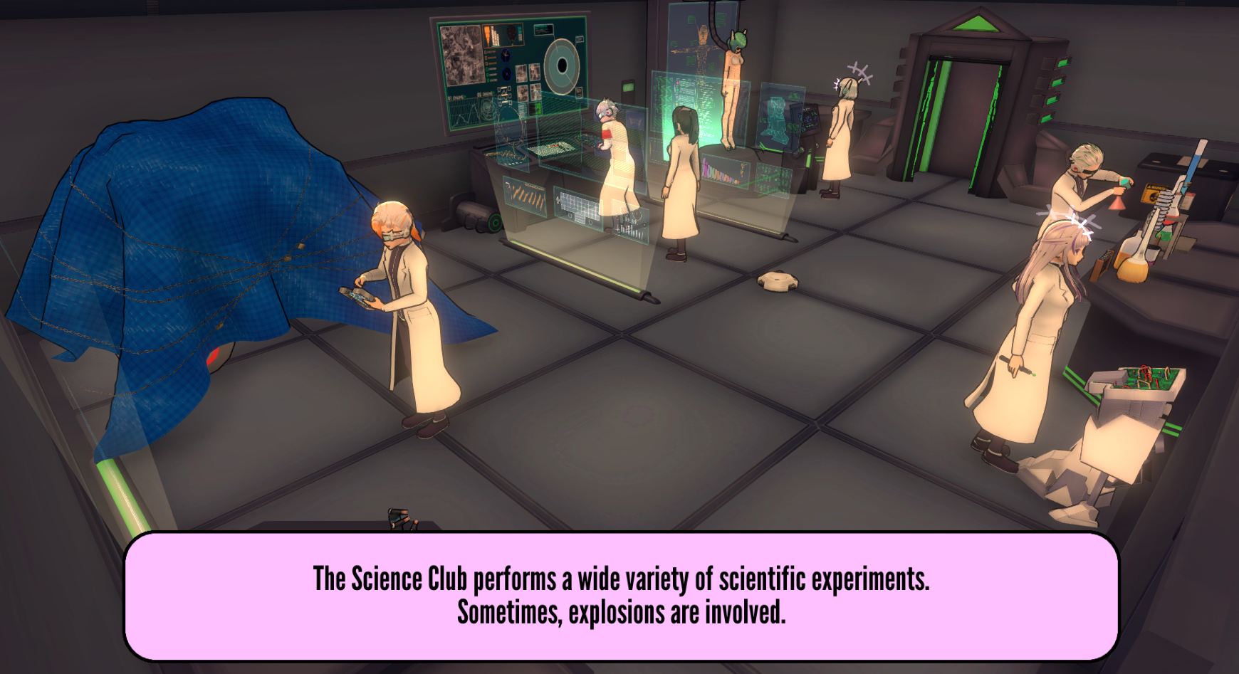 In 202X Mode, it has a gray floor and walls, and a black ceiling with green lights. Each club member has a workstation that fits their area of expertise. In the center of the back wall, Kaga has a supercomputer with two holographic walls on either side. In the back left corner, Horo has a series of holographic displays that he controls with a tablet. Along the front wall, Yaku works at a chemistry table, and Meka works on a machine that sits on the floor. In the back right corner, Homu has a large platform where a robot version of her dead twin sister stands. The room was only remodelled recently, after Kaga joined the school.[1]