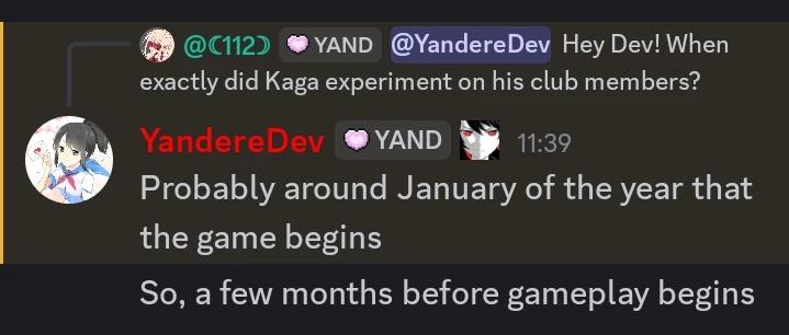 - Kaga experimented on his club members around January of the year the game takes place in, so, a few months before the main game.[8]