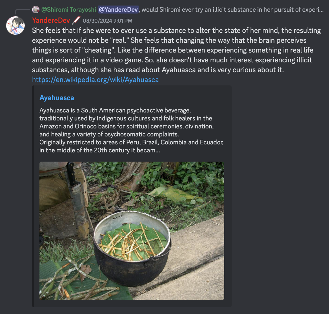 - Shiromi feels that if she were ever to use a type of substance to alter her mind, the experience she gets from the substance wouldn't be real to her. She thinks using a substance would be cheating, as it may change the way that the brain perceives things. As such, she doesn't have much interest in illicit substances or experimenting with them.[112] However, she is interested in Ayahuasca,[112] which is a psychoactive beverage from South America.[113]