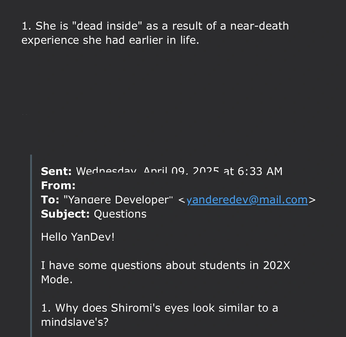 - ↑ https://www.reddit.com/r/yandere_simulator/comments/fc35ny/questions_about_shiromi/