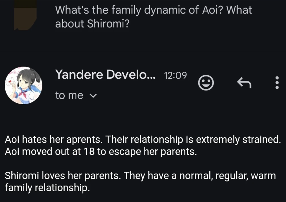 The majority of Shiromi's skills come from her father, who learned his skills from an old man whose family was involved in espionage for centuries. Shiromi shows her appreciation and gratitude to her parents at any given chance.[32] Her parents humor her "shenanigans"[40] such as illegally keeping an endangered Bengal tiger. Shiromi also tells jokes around her parents, but she knows the difference between a situation when it is okay to provide a joke, and a situation to provide a sincere answer.[77] From age 13 onwards, while not attending school, she would go on a family trip to another country.[78] YandereDev mentioned that Shiromi loves her parents and their relationship is "normal" and loving between one another.[79] Additionally, she's slightly closer to her dad, but loves both of her parents a lot.[80]