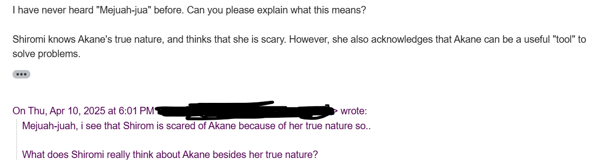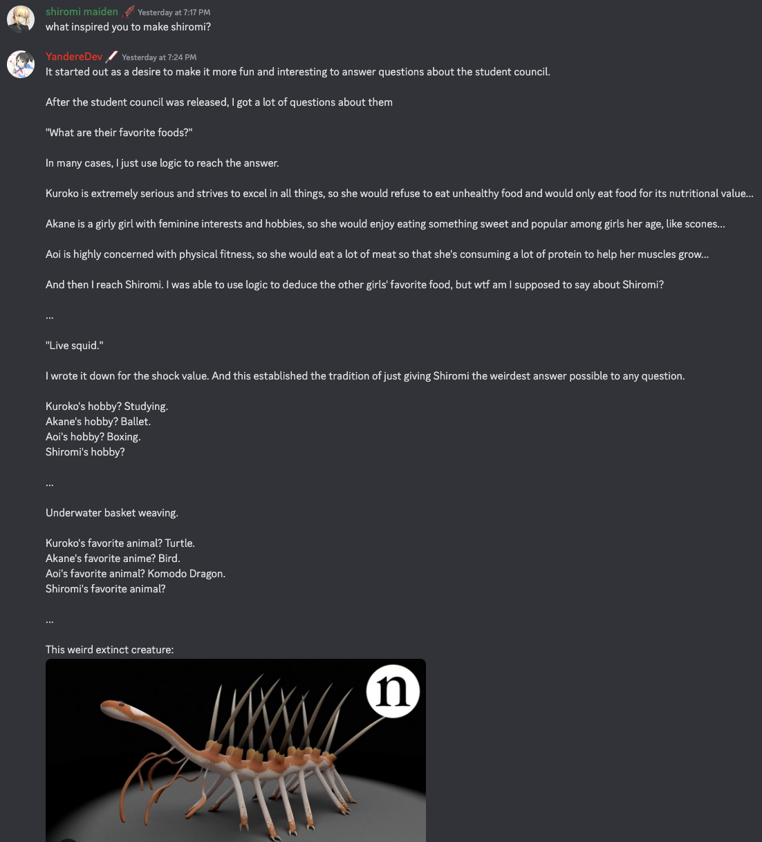 - He initially gave answers related to Shiromi for shock value, and this established the tradition of giving odd and weird answers to any question about her.[43]