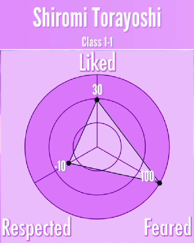 Among the Personas that are currently implemented in the game, Shiromi is Dangerous. If she sees Ayano Aishi commit murder, she will run up, spray her with pepper spray, and restrain her. She will push Ayano away if she gets too close and will pepper spray her if she attempts to kill her without stealth or gets too close five times. She will break up fights between Ayano and a Delinquent by standing in between them and eating a chocolate bar. If Ayano aims her Phone at Shiromi, she'll stand still but will show no reaction. Intimidation will also not work on Shiromi if Ayano attempts to intimidate her after she has joined the delinquents. She is not affected by seduction as well.
