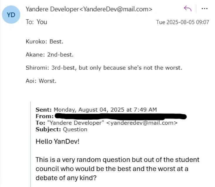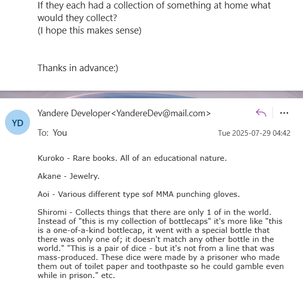 - ↑ https://www.reddit.com/r/yandere_simulator/comments/83wca4/council_questions/dvleapm/