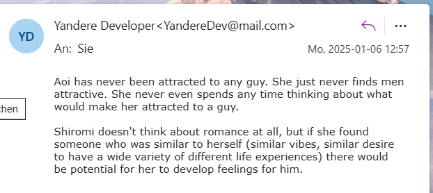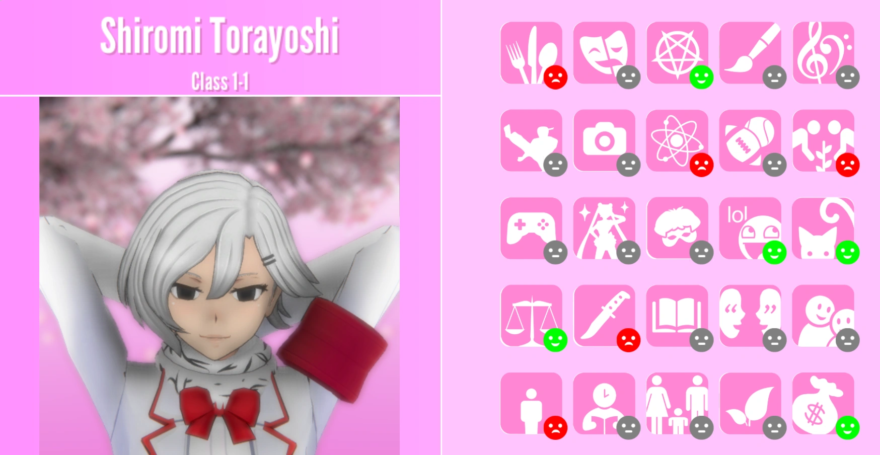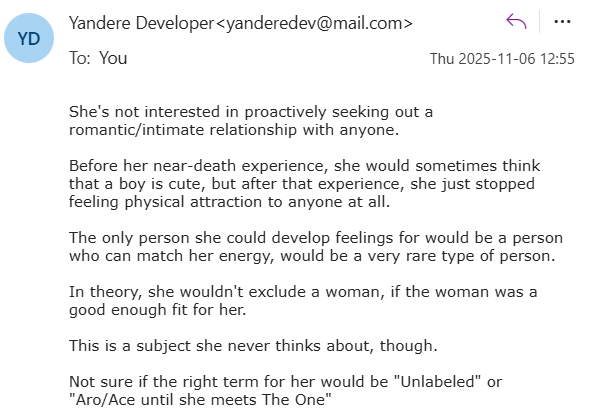 Shiromi doesn't think about romance at all, but if she found someone similar to herself — similar vibes, similar desire to have a wide variety of different life experiences, there would be potential for her to develop feelings for that person.[72] Overall, she has a fairly normal way of approaching romance;[18] she would like to experience romance and love, however, she doesn't want to rush into a relationship and have a bad experience. She's not interested in proactively seeking out a romantic/intimate relationship with anyone and never thinks about this subject. Before her near-death experience, she would sometimes think that a boy is cute, but after that experience, she just stopped feeling physical attraction to anyone at all. In theory, she wouldn't exclude a woman, if the woman was a good enough fit for her. YandereDev describes her sexual orientation as either "unlabeled" or "aromantic and asexual until she meets The One".[73]