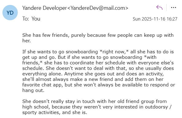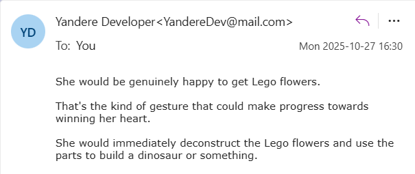https://www.reddit.com/r/yandere_simulator/comments/7s0r8y/question_for_yandere_dev/ - ↑ 13.0 13.1