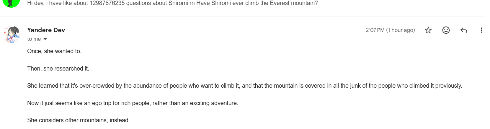 - In fact, Shiromi once wanted to climb Everest. Then she researched it, learned that it's over-crowded by the abundance of people who want to climb it, and that the mountain is covered in all the junk of the people who climbed it previously. Now it just seems like an ego trip for rich people, rather than an exciting adventure, so she considered the other mountains instead.[41]