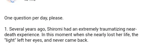 The reason why Shiromi is eccentric, along with the only person without shining eyes, was due to the fact she was involved in a near-fatal and traumatizing car crash during elementary school that changed her perspective of the world; the trauma caused by this event made the "light" in her eyes not reappearing again because of nearly losing her own life.[26] As a result, she is "dead inside," which makes her eyes similar to a mindslave's.[27] She says the life that she lives now is a bonus life that she isn't supposed to have. That she has "extra" time on earth and doesn't know how much longer she can live. 100 years or a few minutes, she "has no right" to complain if she dies. Rather, she uses this extra time to do many different experiences. Her last words would be "Oh, well."[28]