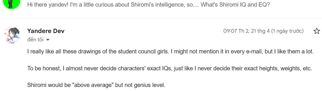 - When YandereDev was asked what inspired him to create Shiromi, he said it was a desire to "make it more fun and interesting to answer questions" involving the student council.[43] He says that the goal is to answer any question related to the Student Council girls by taking the first three girls as seriously as possible, then giving wacky answers for Shiromi.[54]