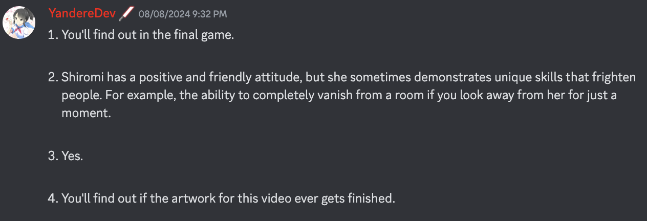 - ↑ https://www.reddit.com/r/yandere_simulator/comments/cbdovv/sc_questions/