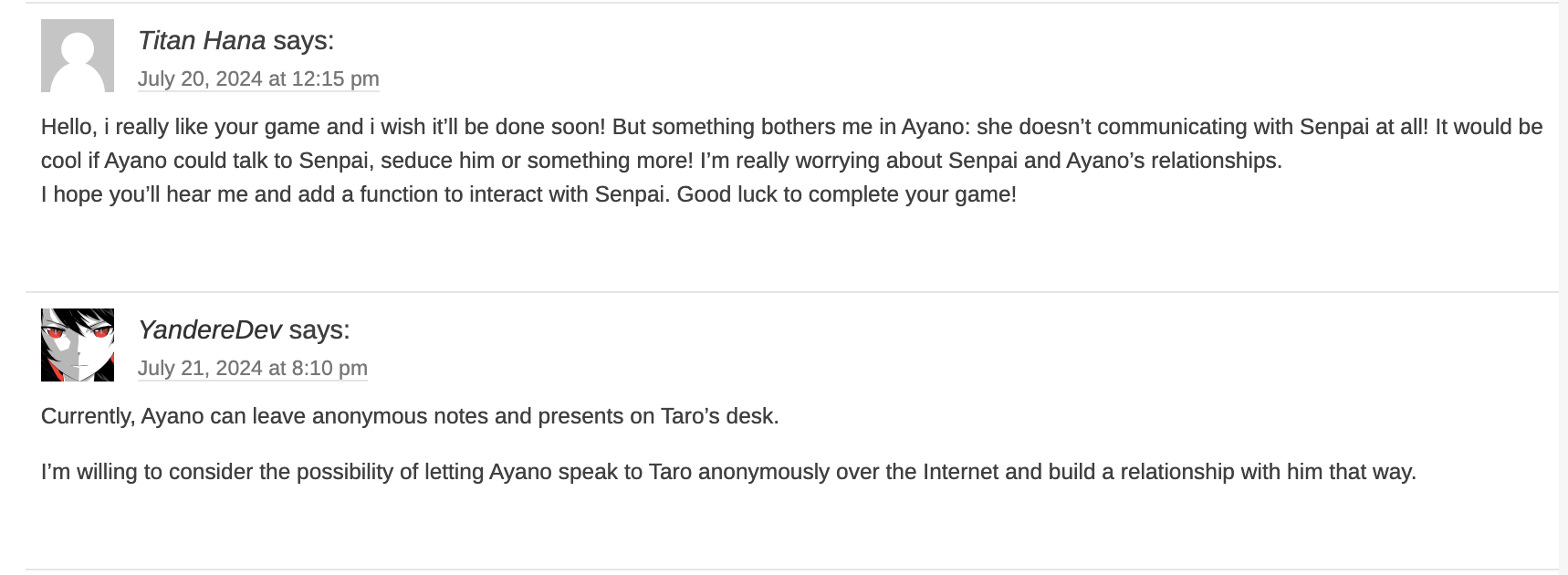 - YandereDev may add the possibility of Ayano annoymously speaking to Taro Yamada and build a relationship with him via the internet.[7]