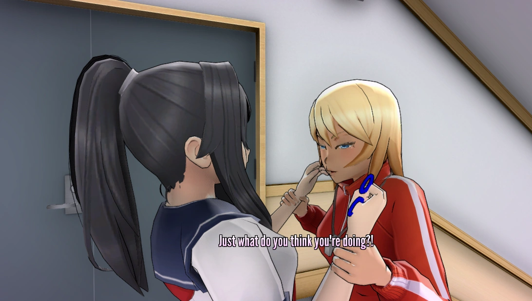 If a teacher sees the protagonist murder an NPC within their line of sight, they will immediately run to pin her down and disarm her. However, if she has at least one level of strength, or is in the Martial Arts Club, there will be a struggle mini-game, similar to the Heroic persona. If the protagonist wins, she will stab the teacher in the chest. If the protagonist fails, the teacher will take her weapon and pin her down.