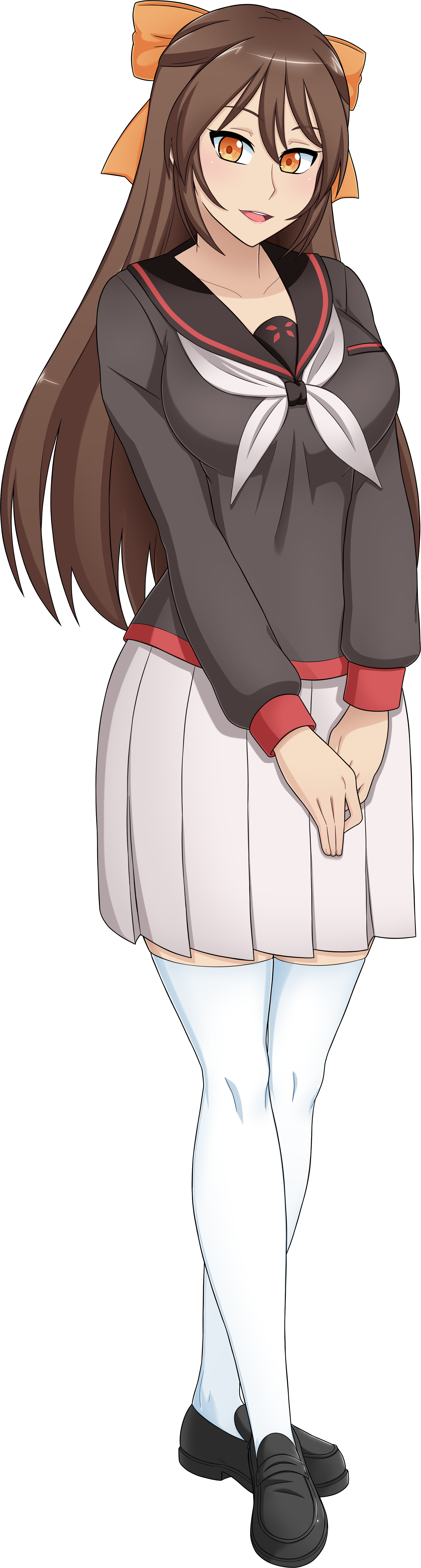 She wears the default 1980s uniform with a pair of white stockings and a peach bow on the back of her head.