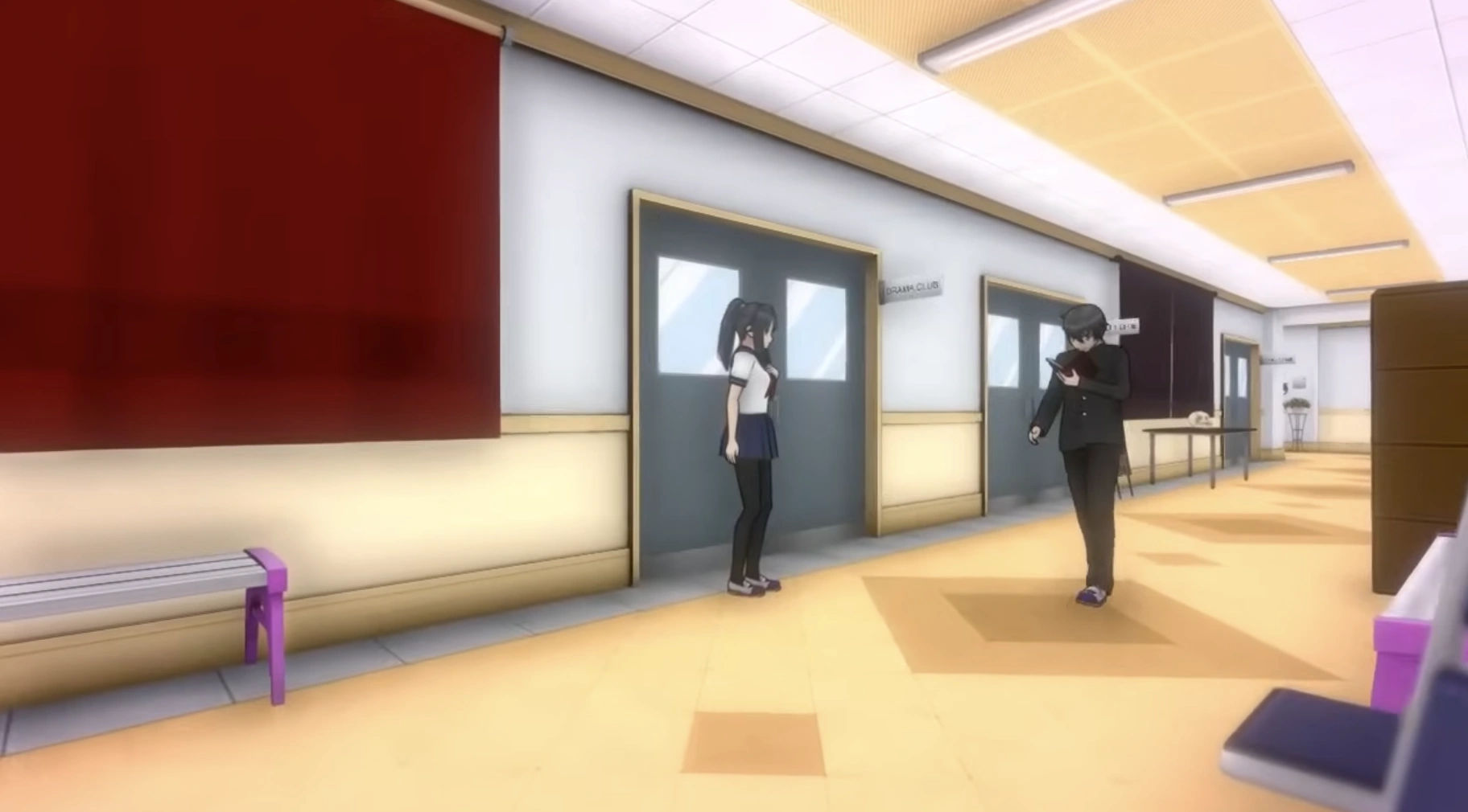 Ayano Aishi observing her Senpai from afar outside the Drama Club, as seen in the 202X Mode tutorial pre-cutscene.
