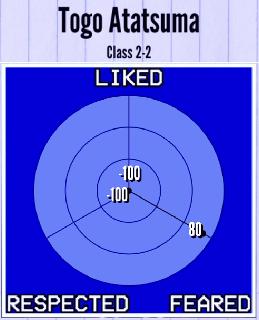 At 7:20 AM, Togo enters the school grounds. He walks to his locker at 7:30 AM and changes from his outdoor shoes to his indoor shoes. At 7:40 AM, he walks to the Incinerator and talks with Shichiro Kurosapu, Taichi Hiranaka, Saburo Meshino, and Seishiro Sadanaga.