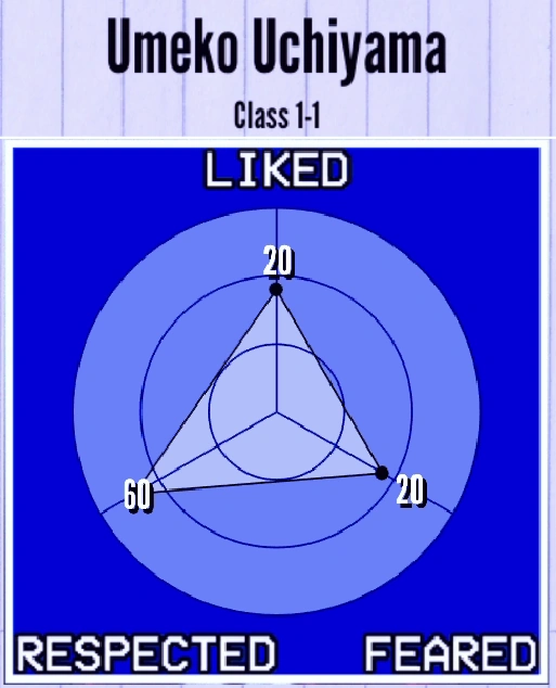 Among the Personas that are currently implemented in the game, Umeko is a Snitch. If she sees a corpse or witnesses a murder, she will run to the landline phone in the Faculty Room and call the Police. She cannot participate in physical fights against murderers.