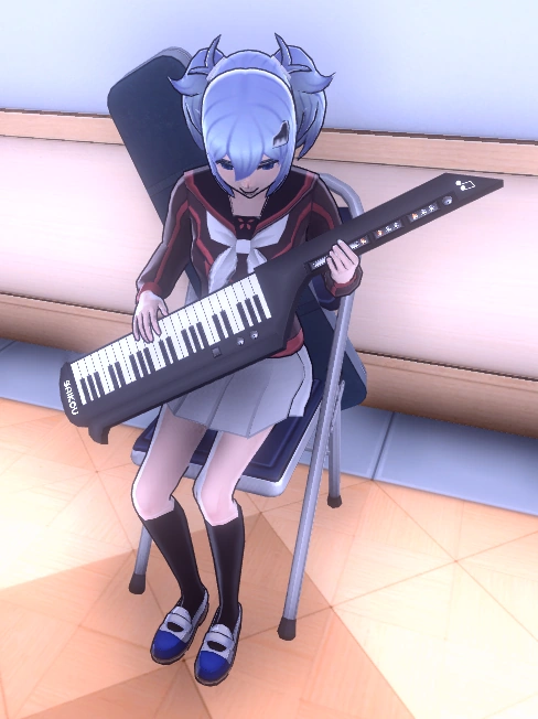 She wears the default 1980s uniform with a heart-shaped piano hairpin on the left side of her head and a key-tar case on her back.