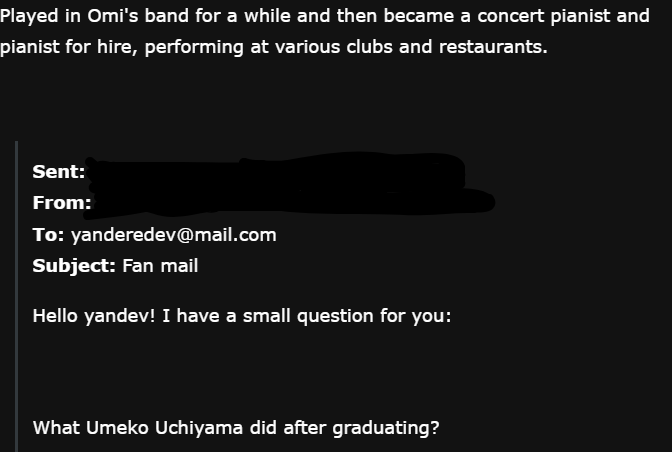 Before the June 30th, 2025 build, when performing the Light Music Club minigame, Umeko wore a dull navy blazer with dullened teal outlines, a deep blue bowtie, and a gray-white skirt that reached above her knees. Her outfit was a reference to Yandere Simulator back in 2014.[2] She used a silver tambourine with gold jingles in her sprite.