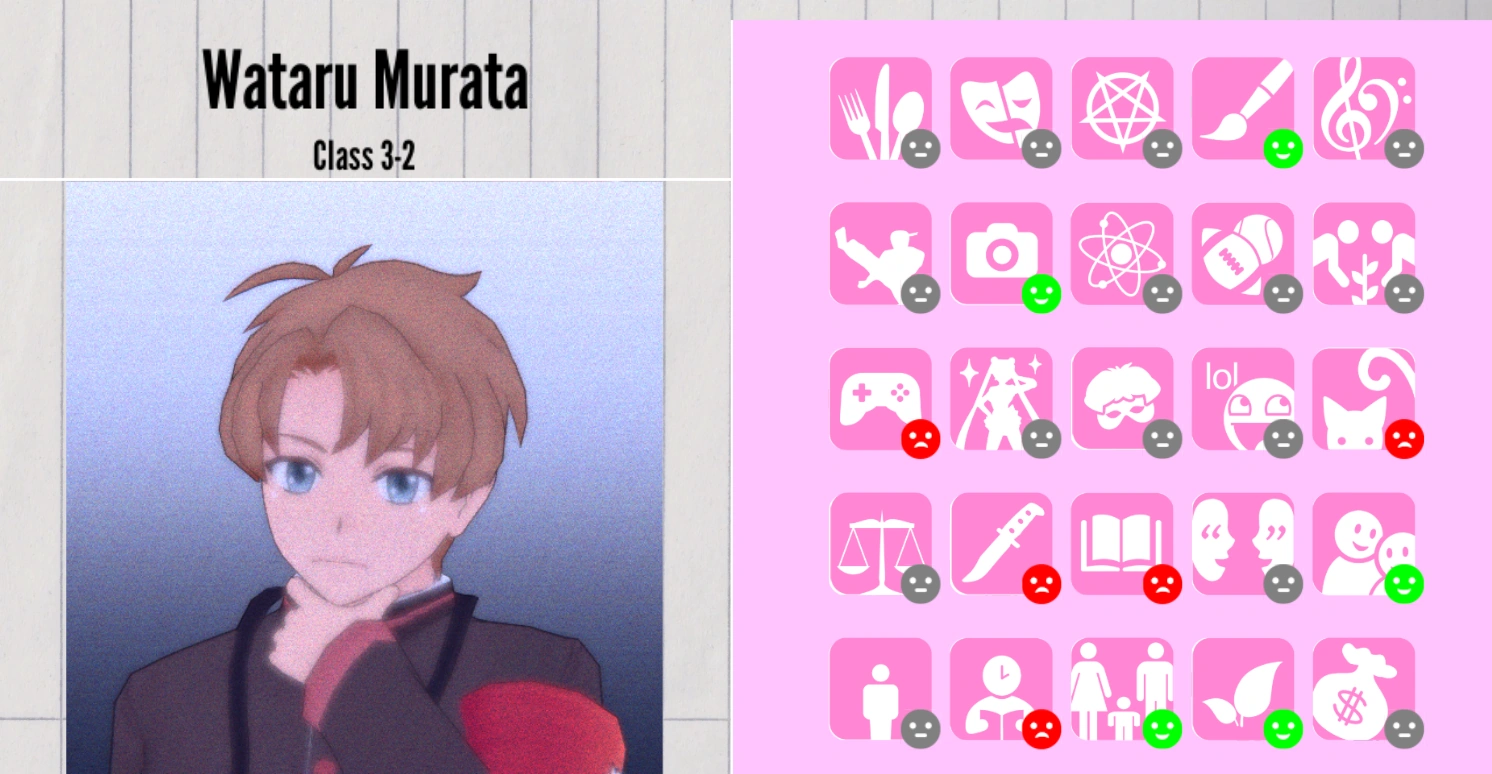 Among the Personas that are currently implemented in the game, Wataru is a Sleuth. When the school atmosphere is above 80%, he will act similarly to Fureddo Jonzu: if he discovers a corpse, he reacts like a Snitch. If he witnesses a murder, he will react with the Heroic persona.