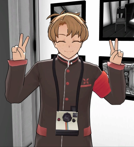 He wears the default 1980s uniform with a Polaroid camera attached to a black strap hanging from his neck. Since he is the leader of the Photography Club, he wears the "Red Armband of Leadership" with a resemblance to a camera on his left arm.