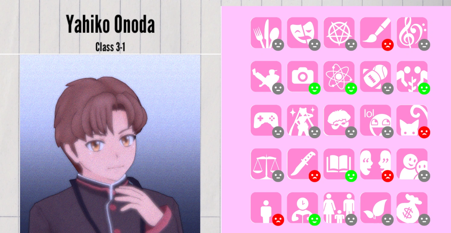 Among the Personas that are currently implemented in the game, Yahiko is a Sleuth. When the school atmosphere is above 80%, he will act upon the Snitch persona if he sees Ryoba Aishi commit murder or finds a corpse. If he witnesses Teiko Nabatasai's murder, he will run to Ryoba and try to apprehend her.